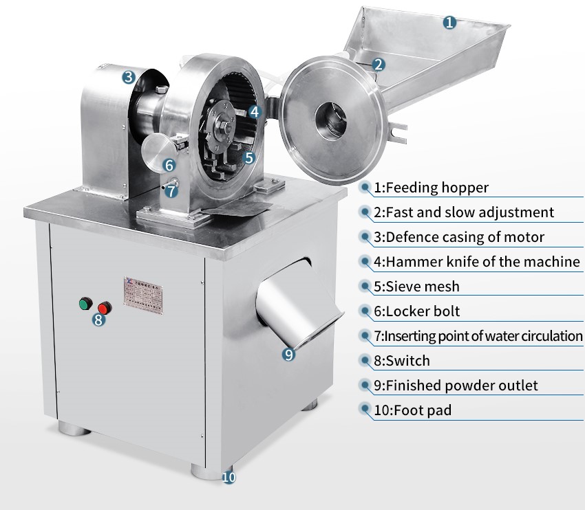 Food grinding is mainly applicable to the grinding of materials in harmaceutical, chemical, food and other industries. Forbidden to crush flammable and explosive materials. Not used for crushing metal objects. Not suitable for crushing large blocks of material. Not suitable for crushing the moisture content is too high, the oil content is too high because the material, after crushing water or oil, forming a paste, will block the screen effect of discharge, resulting in the discharge is not smooth, even death card, boring machine phenomenon. This machine is not suitable for crushing all viscous material, is not suitable for heating become soft and sticky material.