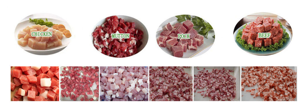 This equipment is used to chop or dice a variety of raw meat into cubes, strips, and slices. It can be used to cut fresh/frozen meat, cooked meat and poultry (chicken, ducks, etc.) with/without bones. The cut-out cubes can be used to make hot dogs, smoked sausage, ham, meatballs, etc. it is widely suitable for hotel, restaurant, chain catering, meat food processing factory, and school hall.